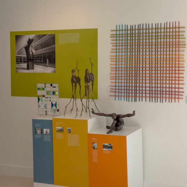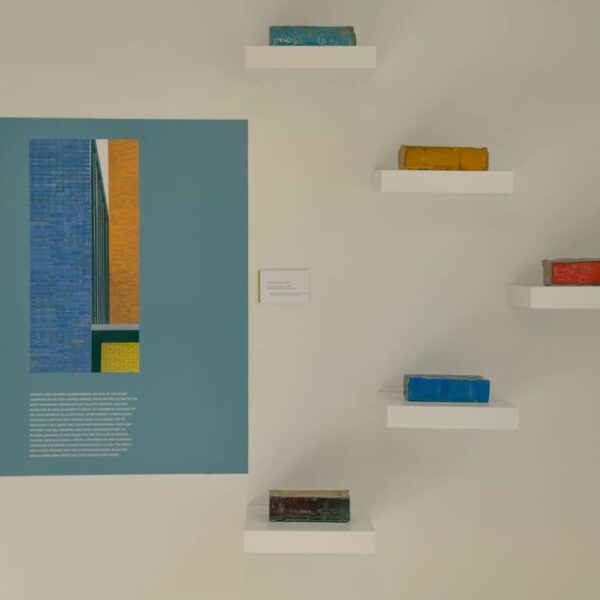 Saarinen convinced GM to fund a kiln to produce glazed bricks to “reflect the sun as autumnal leaves,” and commissioned sculptor Alexander Calder to create “Water Ballet” a fountain that features jets of water that rise, fall, and rotate in patterns, supplied by an enormous manmade lake in the center of the campus. The exhibition contains a replica of this brick wall, actual glazed bricks, and video of the performing fountain in both daylight and darkness.