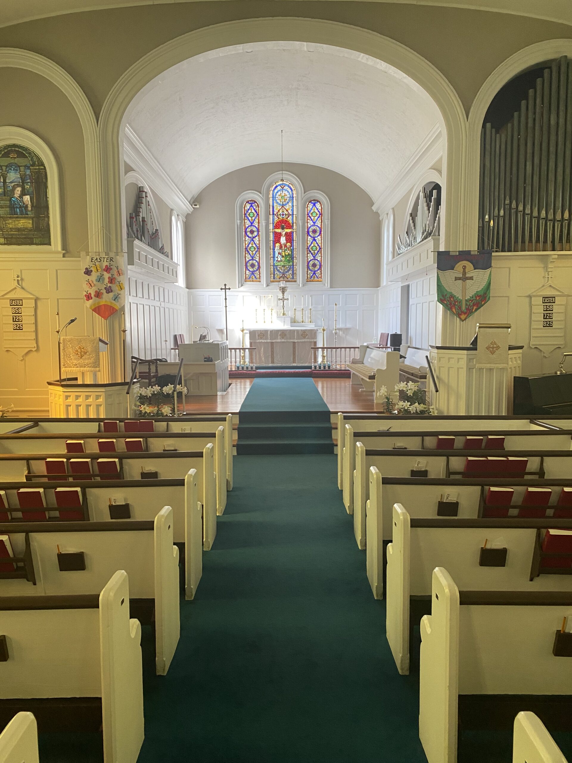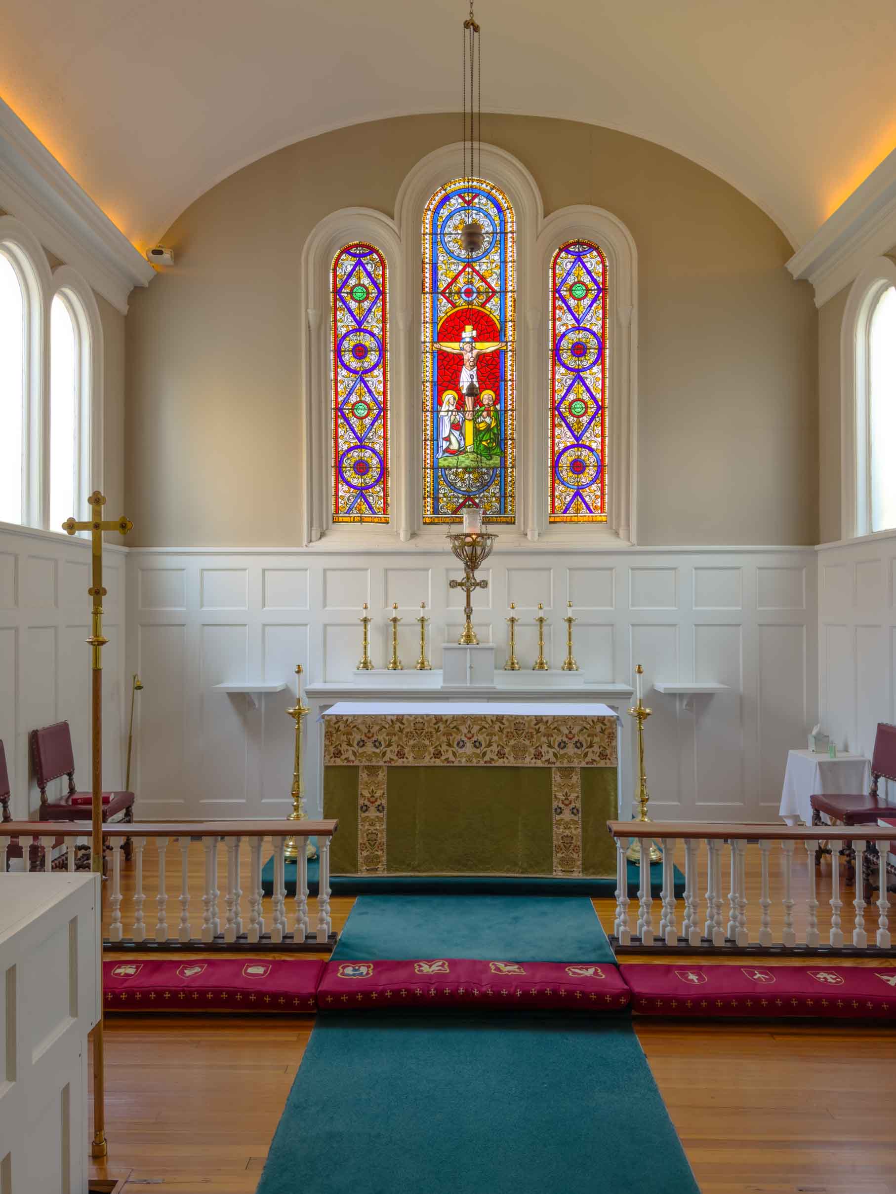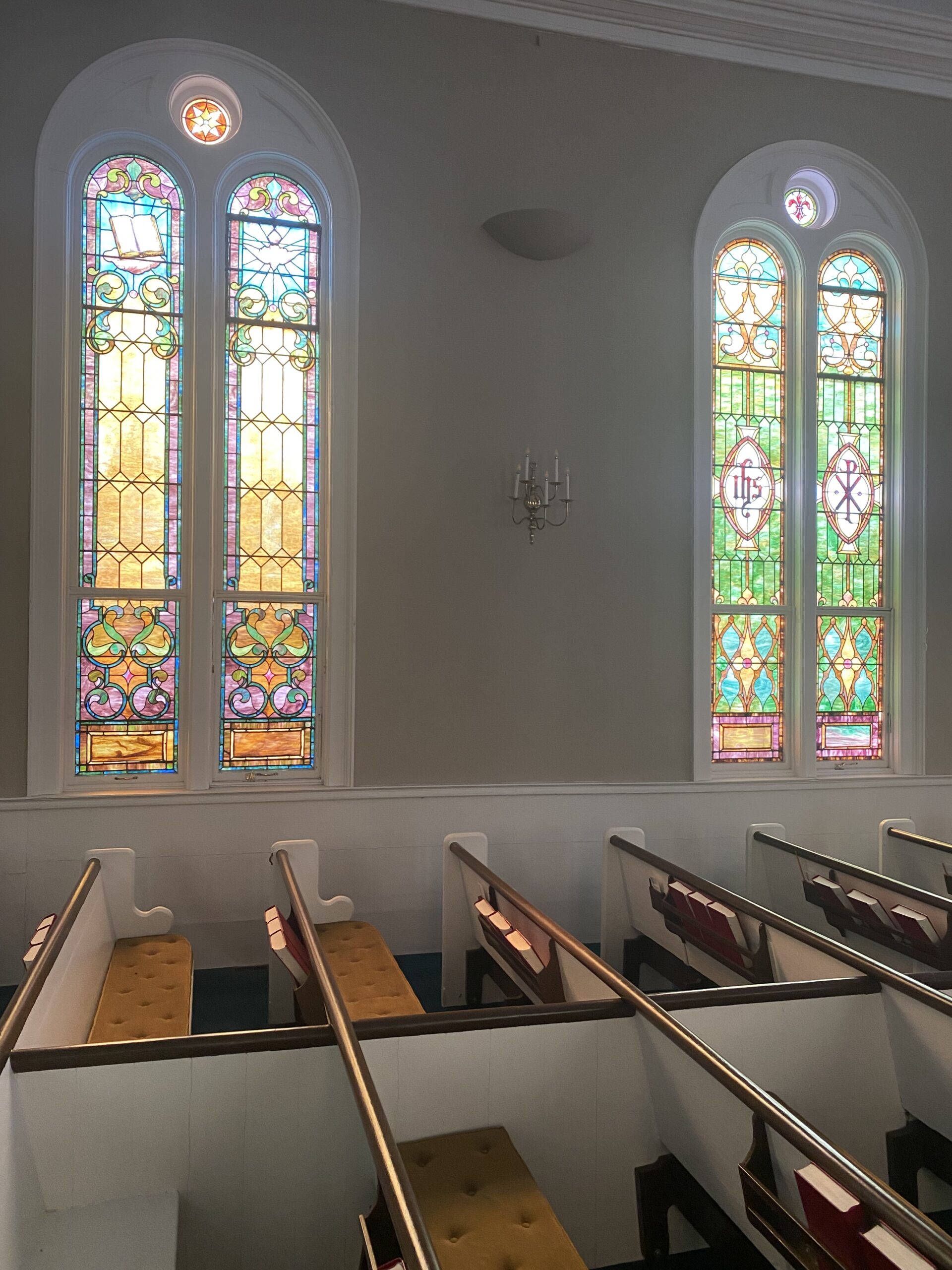 The exceptional stain glass windows are filled with Christian iconography.  The one over the Baptismal font was designed by Silvermine artist D. Putnam Brinley.
