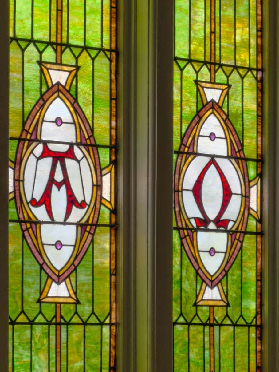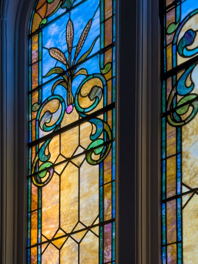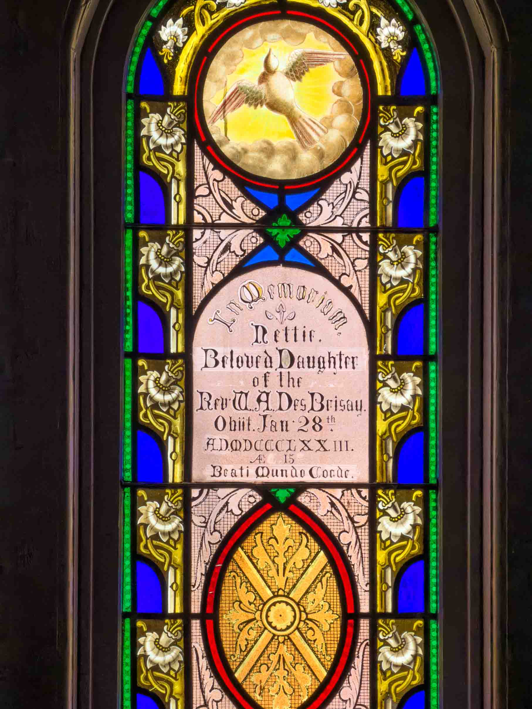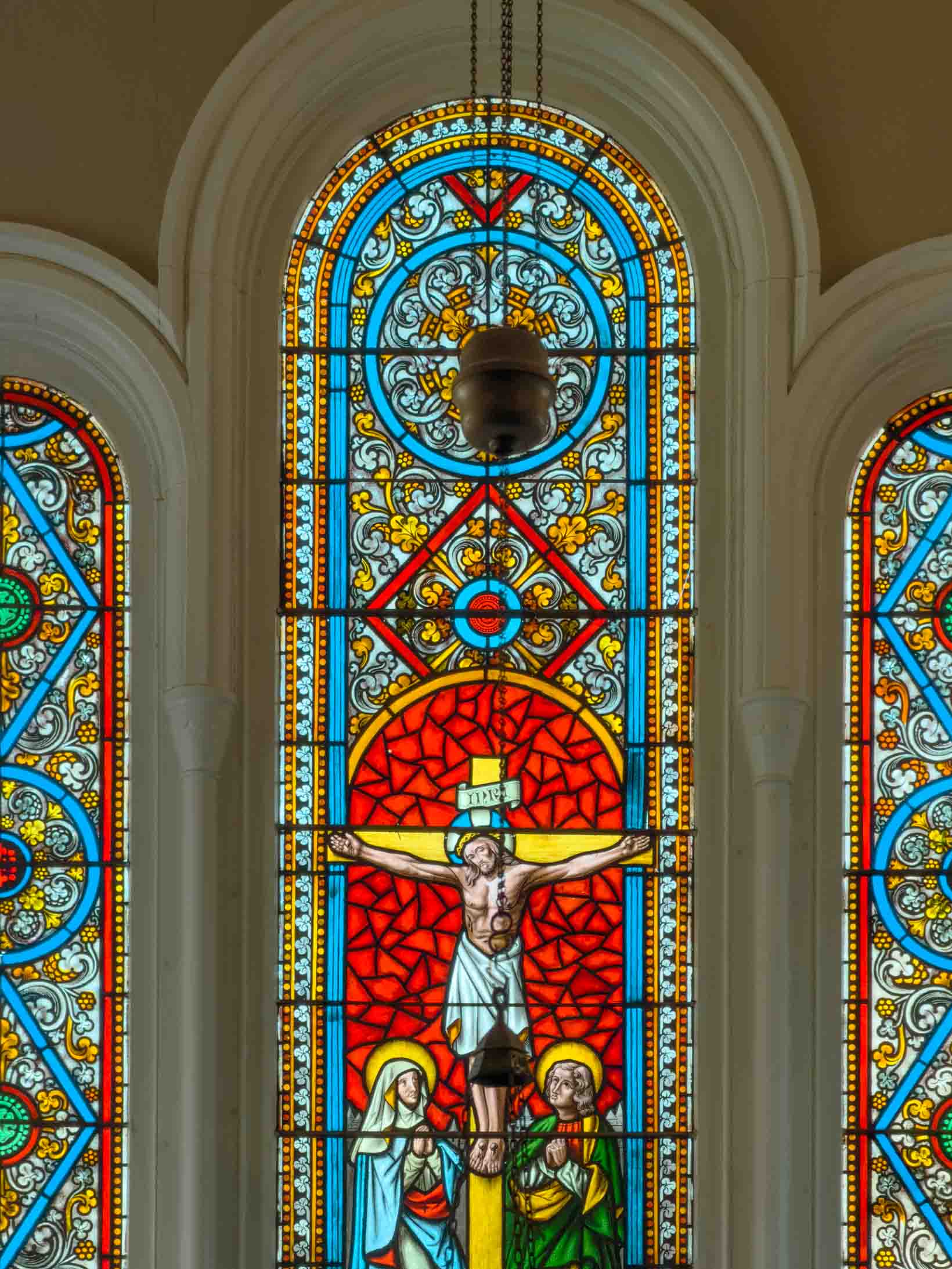 The exceptional stain glass windows are filled with Christian iconography.  The one over the Baptismal font was designed by Silvermine artist D. Putnam Brinley.